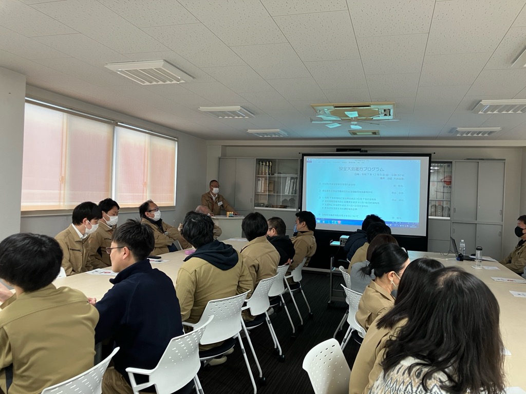 2025年12月5日(金)に弊社大会議室にて安全大会を開催しました。 当日は、安全衛生管理方針の説明や、直近の労災事故発生状況の共有を行い、全社員で安全意識を再確認しました。